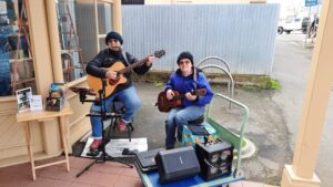 Lake Mist serenading on a blistering cold wintry day. Our name matches the weather! Our pinkies were getting stuck to the fret-boards…Folk enjoyed and sang along to keep themselves warm.